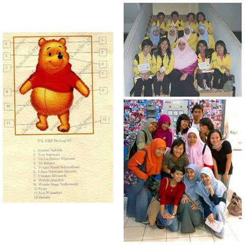 Kiriman dari Yenty Tjandra 曾 “Persahabatan kami dimulai sejak tahun 2005 bertemu dengan bu Nining B Prihantini (pembimbing akademik). Bu nining menyebut kami Winnie The Pooh (WTP), tokoh kartun World’s Ambassador of friendship. WTP berjumlah 12 orang. WTP mempunyai mata kanan,mata kiri,telinga kanan, telinga kiri, tangan kanan, tangan kiri, hidung, leher, perut, mulut, kaki kanan dan kaki kiri. Bagian tubuh WTP tersebut merupakan nama-nama kami. Ibu Nining selalu berpesan kami harus bersama-sama dalam suka dan duka untuk menghadapi kehidupan di dunia. Walaupun kami berbeda suku, agama tetapi kami tetap bersatu.” #ILOVEBHINNEKA