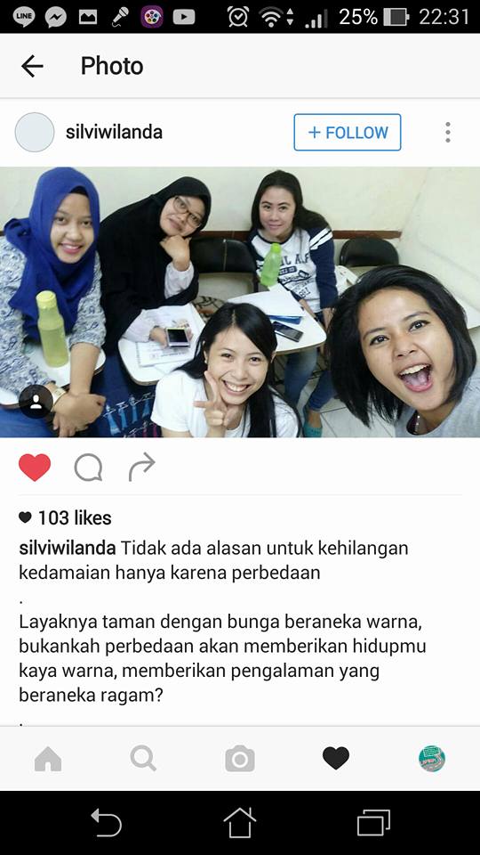 Kiriman dari Renicha Dhammarajini “Persahabatan itu dijalin bersama sama, tidak memamdang asal, suku, ras, bahasa dan agama. Kisah kita sama sama berjuang waktu penelitian, makan bareng, tidur bareng, nangis bareng, ngerjain skripsi bareng, capek bareng, proposal bareng, ketawa bareng, degdegan bareng, ketemu ular bareng, sidang bareng, soon wisuda bareng. 😘😘😘😘 Love u guys Enjoy our life with friendship” #ILOVEBHINNEKA