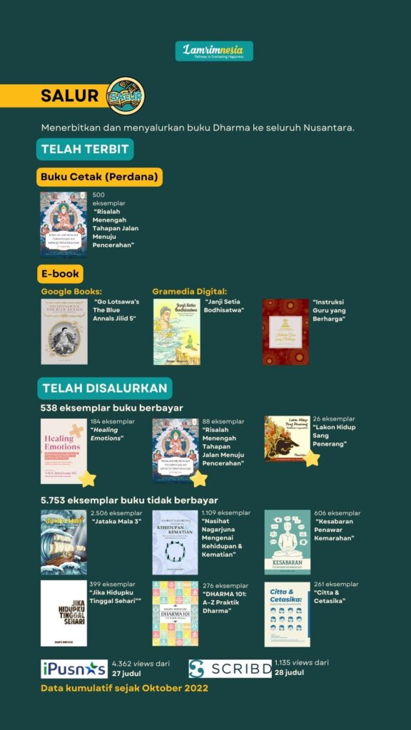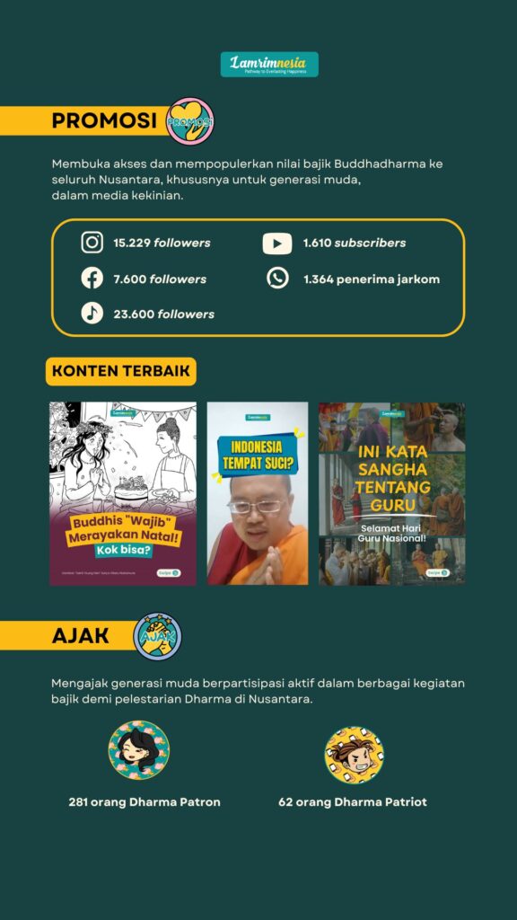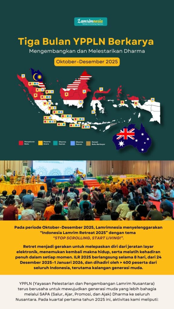 Terima kasih dan turut bermudita atas dukungan dari 281 Dharma Patron, 62 Dharma Patriot, dan para Sahabat Lamrimnesia yang berkontribusi selama triwulan keempat tahun 2025! Ini dia aktivitas pelestarian dan pengembangan Dharma yang telah kita lakukan bersama: